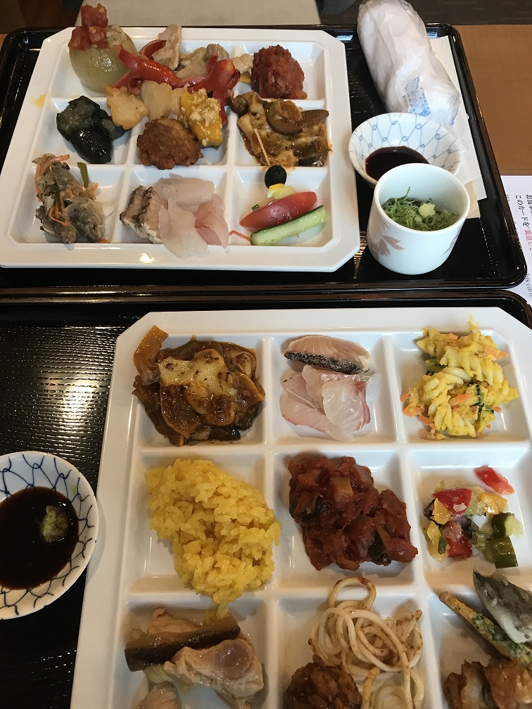 今回の宿、ビュッフェ用のメインのお皿は、30cm角くらいのサイズで、3×3の小さなお皿が繋がったような形になっていて、いろんな料理をちょっとずつ載せられるようになっていた。