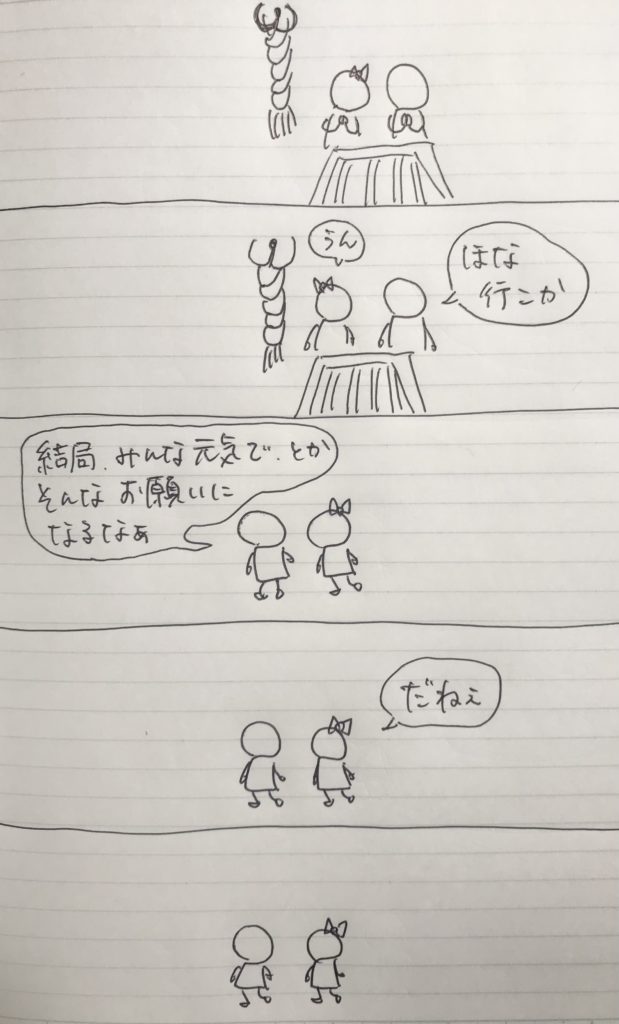 片道1〜2キロくらいの神社へ向けて、お賽銭の100円それぞれをポケットに入れ小走りで向かった。