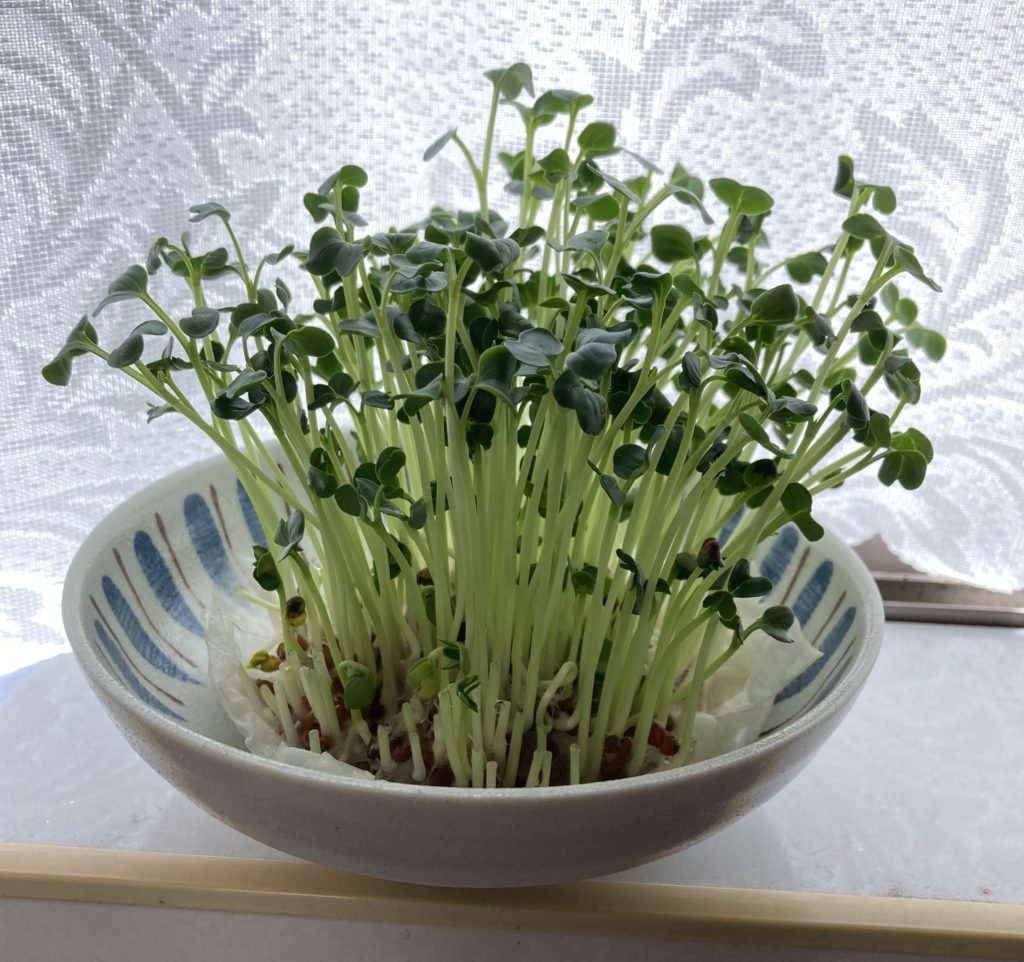 こちらはスーパーで10枚100円弱くらいで売ってるので、うまく育てられれば、カイワレより元もとれそうな気がするし、使い道も広がりそう。