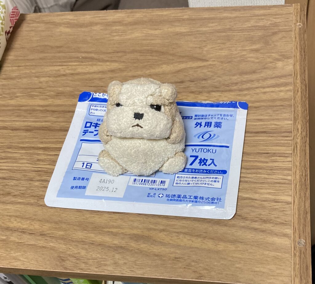 投稿日: 2024年6月27日2024年7月13日嫁も私もそれなりに年月を経て〜 2024.06 嫁は四十肩〜五十肩、私は四十肩は7割かた?治まりつつあるが、椎間板絡みで右足が。 それぞれ年月を経てきていることを感じますな😅 湿布薬の袋は、我々が「ごんた」と読んでいる犬のぬいぐるみの座布団に早替わり!