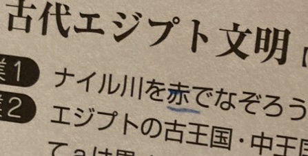 そのひとつに「ナイル川を赤でなぞろう」というのがあったそうなのだが、川は青でしょう?ということで、青でなぞったと言うのである。
